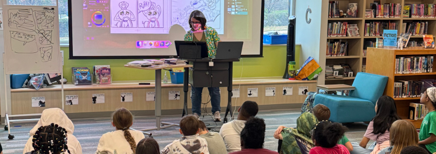 Lindsay Hornsby’s visit to our school library was nothing short of spectacular! Speaking to two classes at once, she held every single student’s attention with her deep knowledge of the comic-making process. For our students, who reach for graphic novels constantly, seeing a professional author and illustrator explain their craft and share their personal experiences was invaluable. Her ability to connect her journey to the students’ passions was truly amazing. It was clear that she sparked a level of excitement for literacy and art within the group.